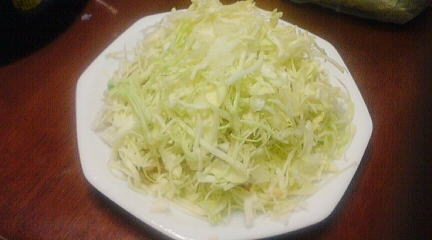 更に!皿に残りのキャベツを盛る!!そして、「だしの素」を全体に振り掛ける♪