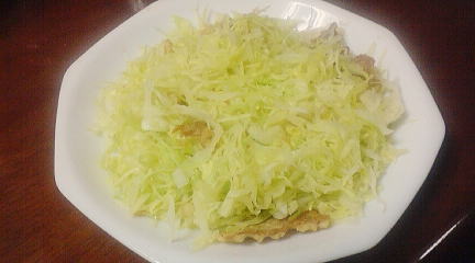 キャベツを千切りにして、半分皿に盛り、その上に天かす・イカ天を乗せる