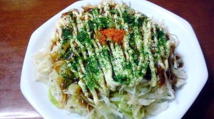 ソース、マヨネーズ、青海苔、一味唐辛子を加えて、完成(〃∇〃) てれっ☆