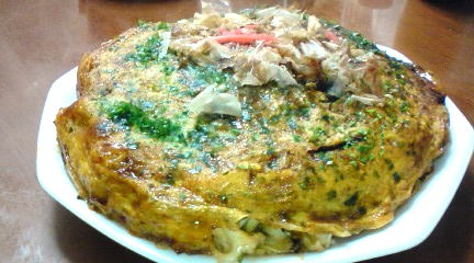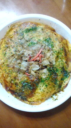 2.丸皿に1を入れ、その上に、お好み焼を乗せる( ̄▽ ̄)σ
